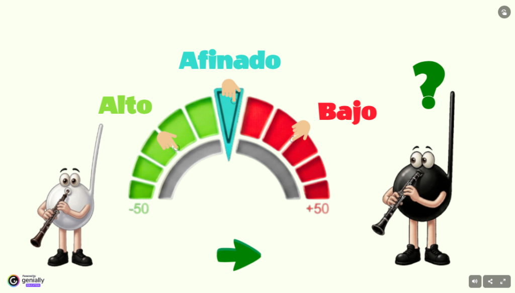 Haciendo clic en cada intérprete escucharás un sonido. Debes seleccionar en nuestro afinador si el segundo instrumentista comparado con el