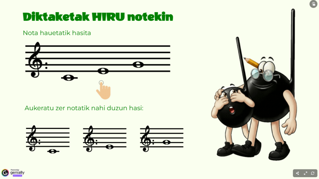 Lau soinuko segidak entzun behar dira eta gero notak eraman doakien lekuetara pentagraman.