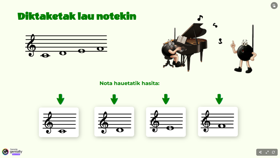 Entzun audio-zatia eta hautatu notak entzuten diren ordenean. Beheko ezkerreko izkinan dagoen pianoan ariketan entzuten diren notak entzuteko aukera duzu.