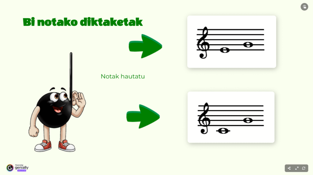 1 – Diktaketak bi notekin Ana Huarte / 19 de apirila de 2022 / Diktaketak bi notekin, Genially_eus, I - Diktaketak, I - Soinuak identifikatu Lau soinuko segidak entzun behar dira eta gero notak eraman doakien lekuetara pentagraman.