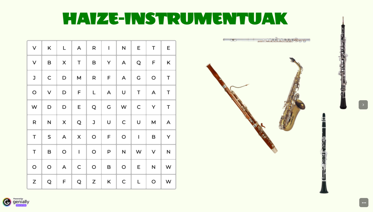 Hemen dituzue instrumentuen famili nagusien letra-zopa batzuk: HAIZEA, HARIA eta PERKUSIOA
