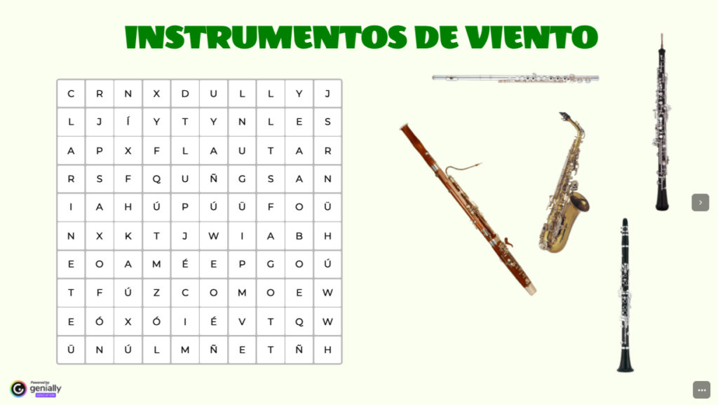 Aquí tenéis varias sopas de letras por familias instrumentales principales: VIENTO, CUERDA y PERCUSIÓN